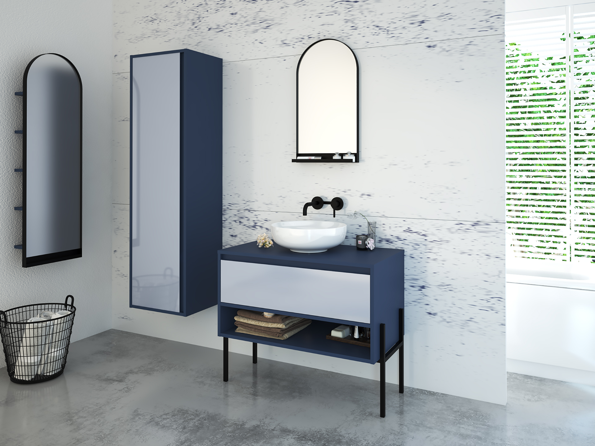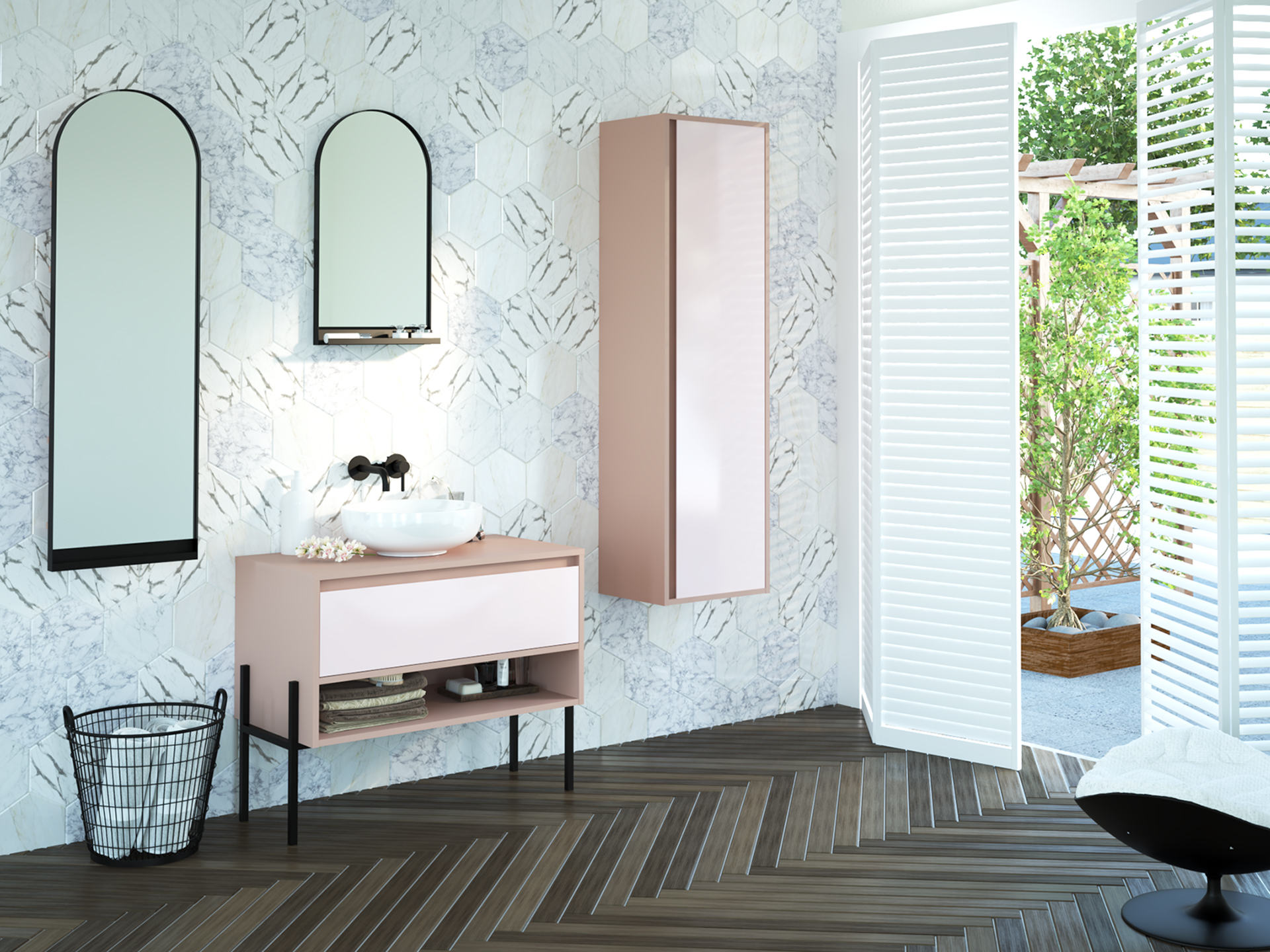 Należą do nich półokrągłe lustra, otwarte szafki, półki oraz rozbudowane struktury podstaw i stelaży. Dzięki temu uzyskano kolekcję lekkich wizualnie i powiększających optycznie łazienkę elementów.