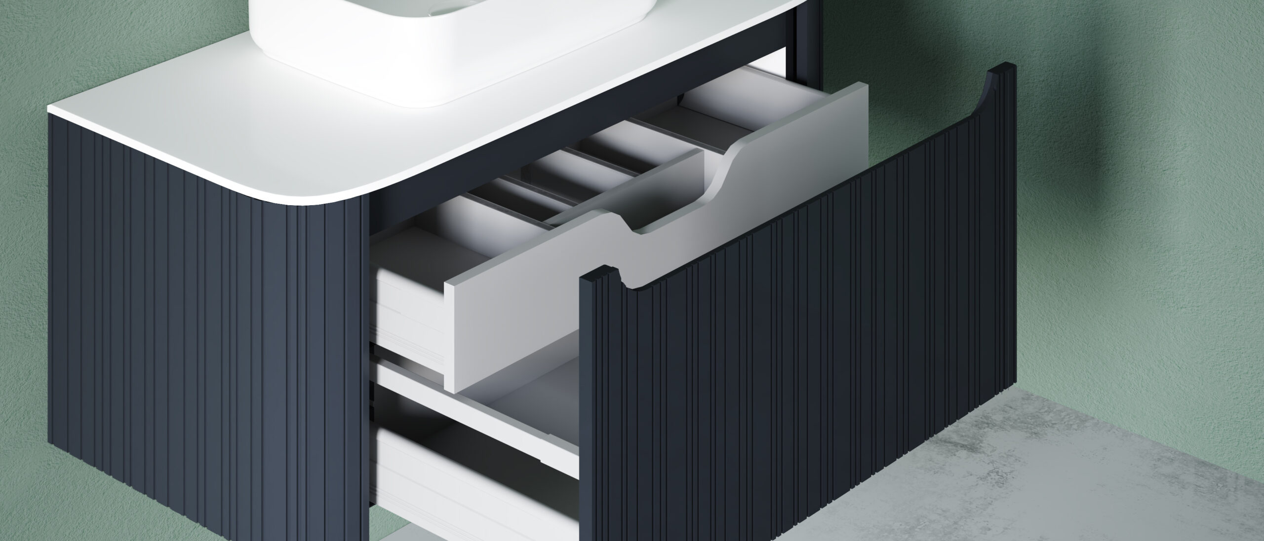 Gloria Style ist die Schwesterkollektion der Gloria 2.0-Linie. Sie verbindet ein gerundeten, frühmodernen Stil und geriffelte Fronten.