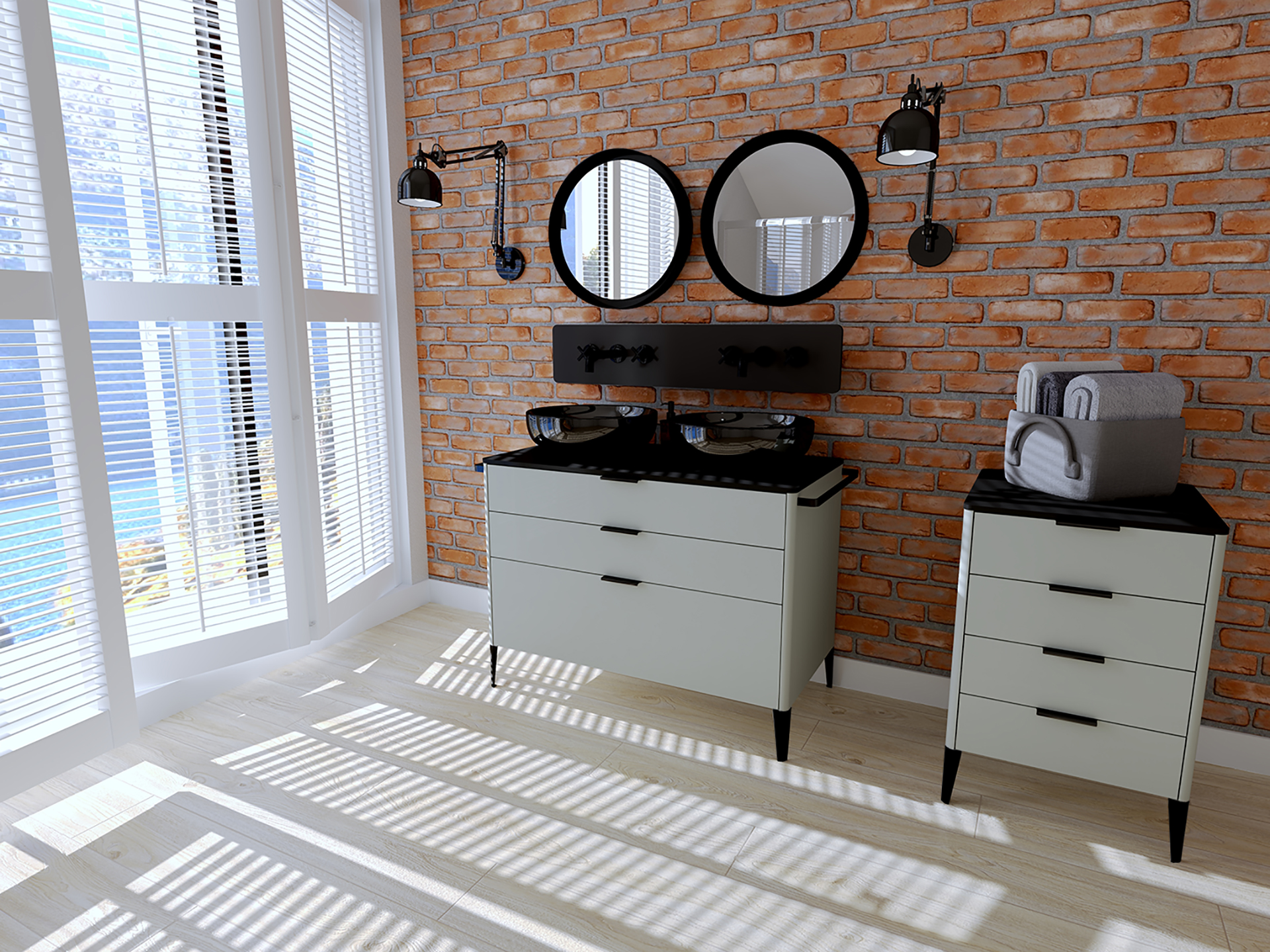 A characteristic feature of the collection are frames and bases made of bent sheet metal with rounded edges to increase safety and comfort of use. The loft style is also emphasised by the steel elements of the mirror frames, hangers and handles that are powder-coated for above-average durability.