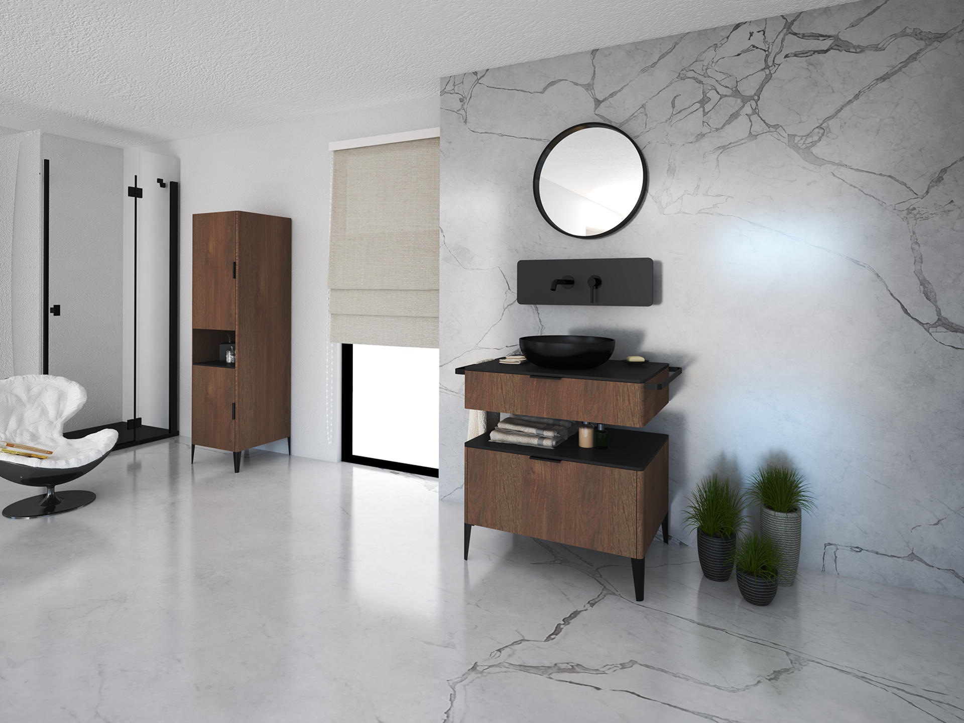 The collection consists of dozens of pieces of furniture ensuring that various needs and functionalities are met in the bathroom.