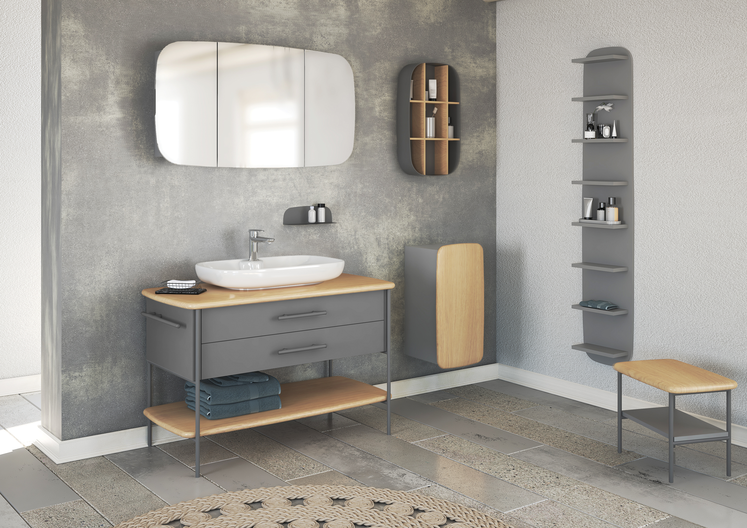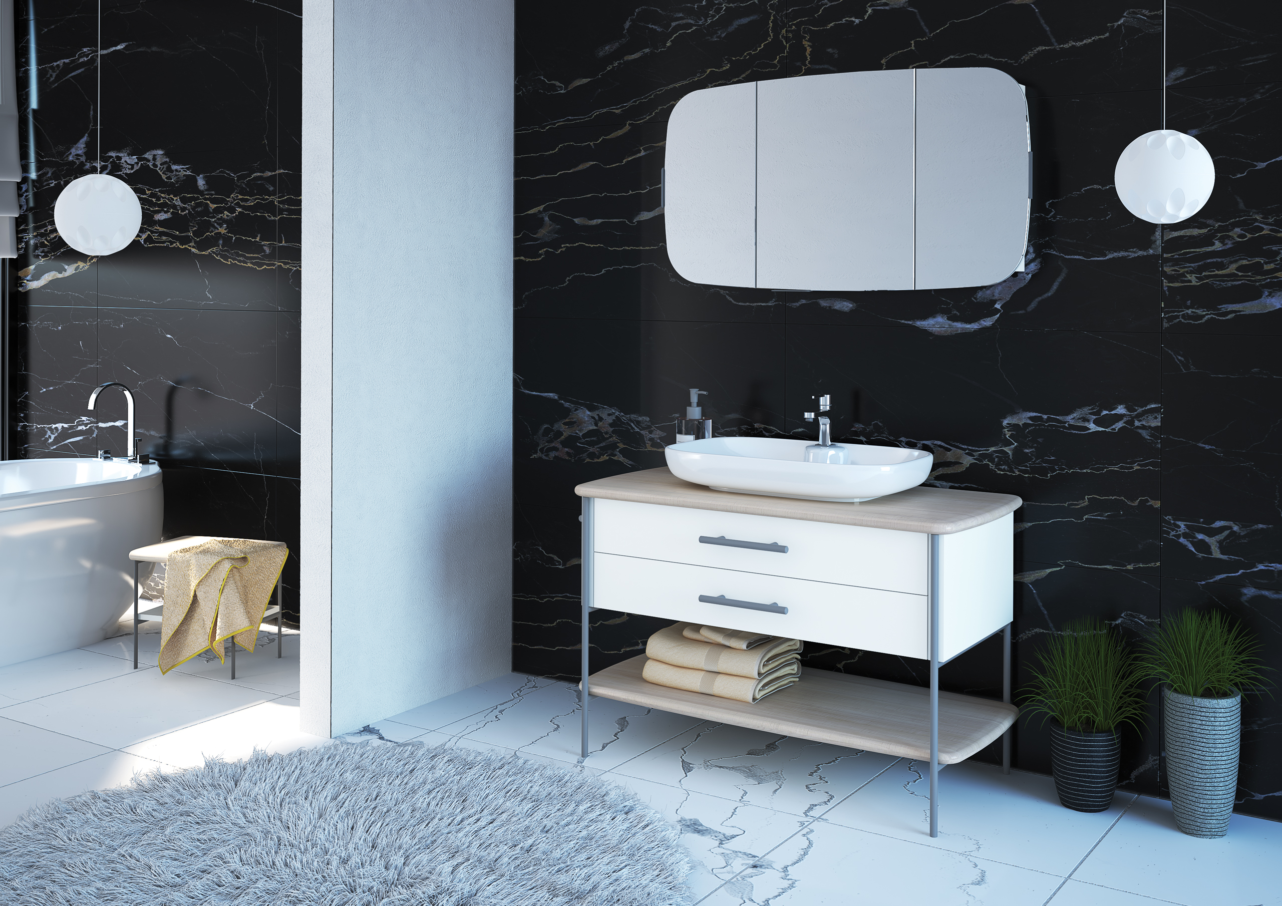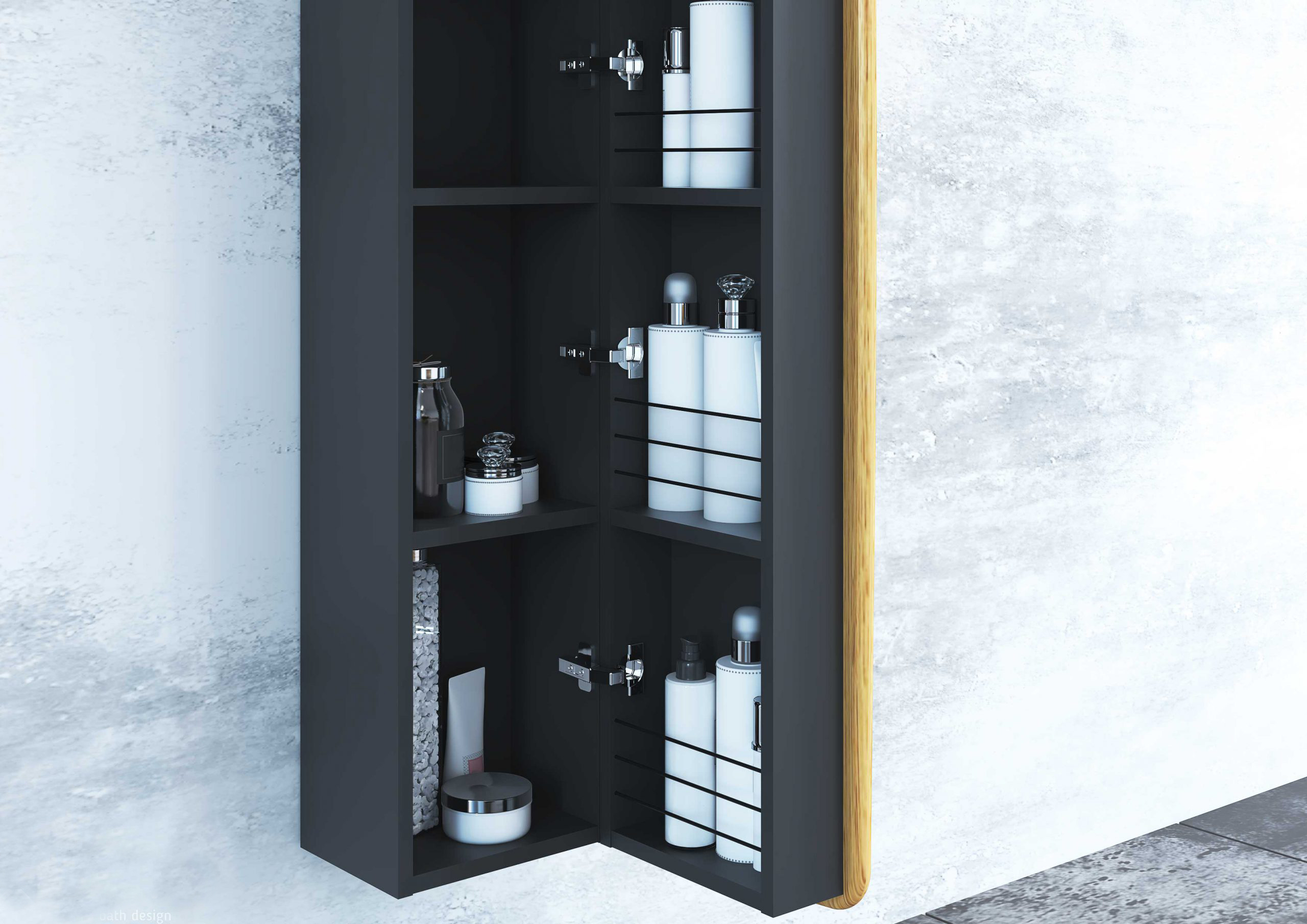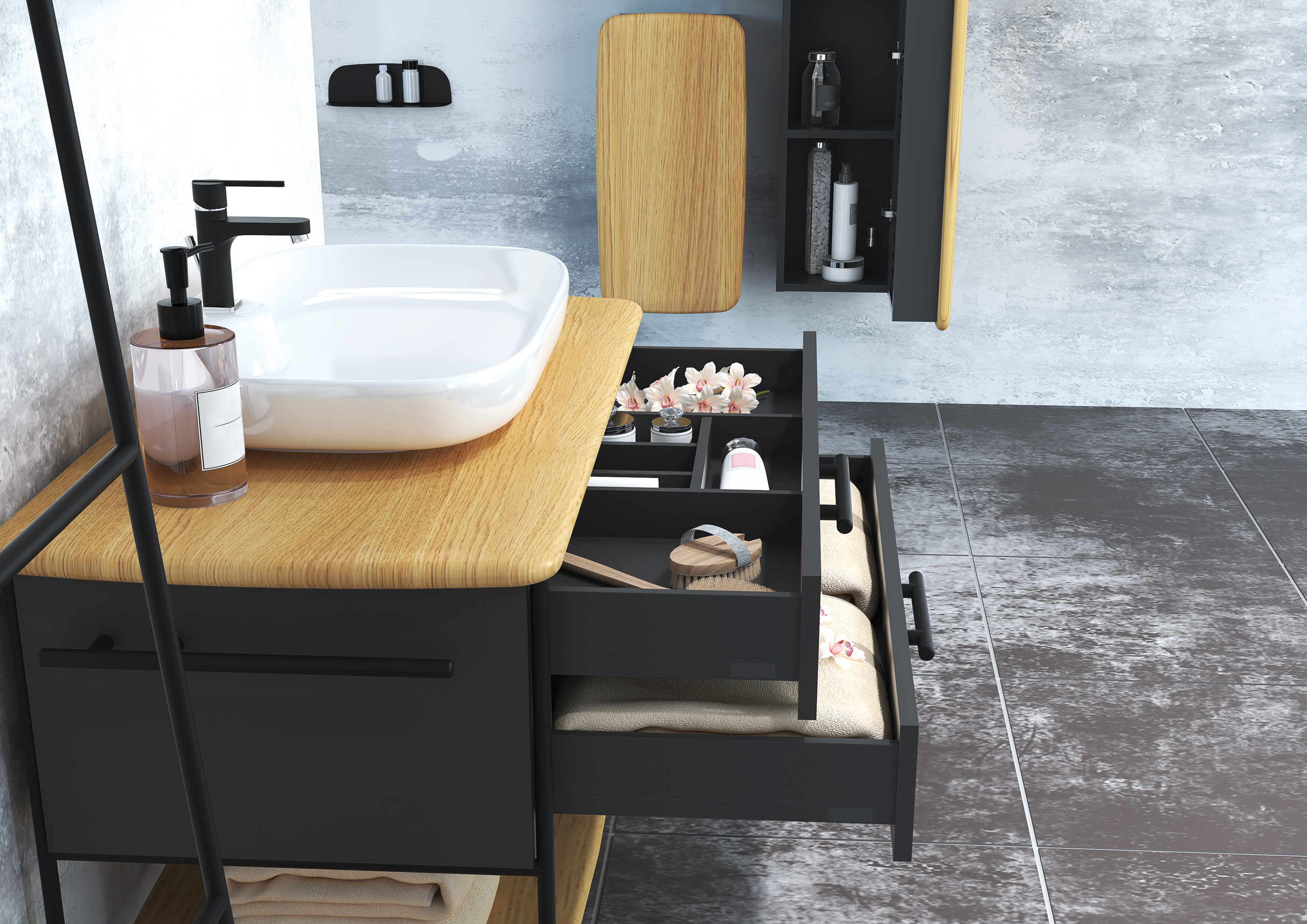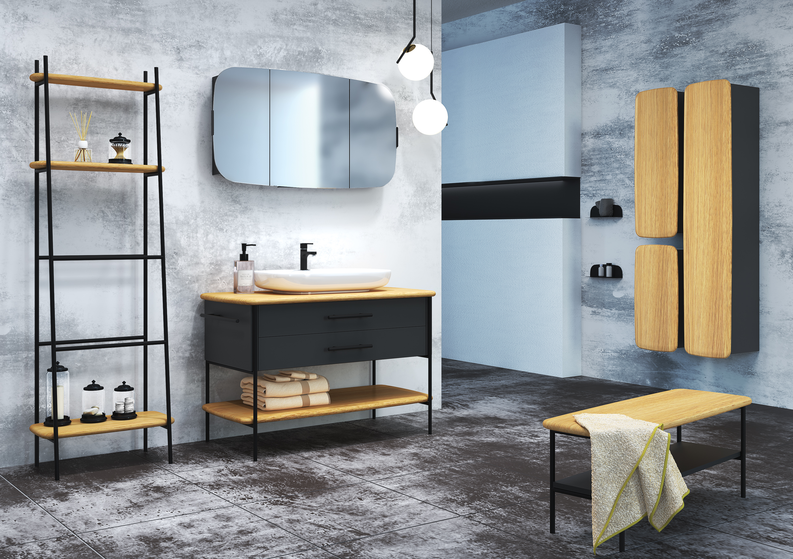 Prostota formy oraz zastosowanie drewna dębowego nawiązują bowiem do natury, co wprowadza do przestrzeni łazienki spokój i harmonię. Meble idealne do stworzenia prywatnej strefy SPA, w której możemy odpoczywać po całym dniu. Zostając w łazience dłużej i traktując ją jako miejsce relaksu. Dodatkowym atutem jest zastosowanie technologii malowania proszkowego dzięki czemu elementy metalowe mają twardą powierzchnię, co sprawia, że są one trwałe i odporne w użytkowaniu.